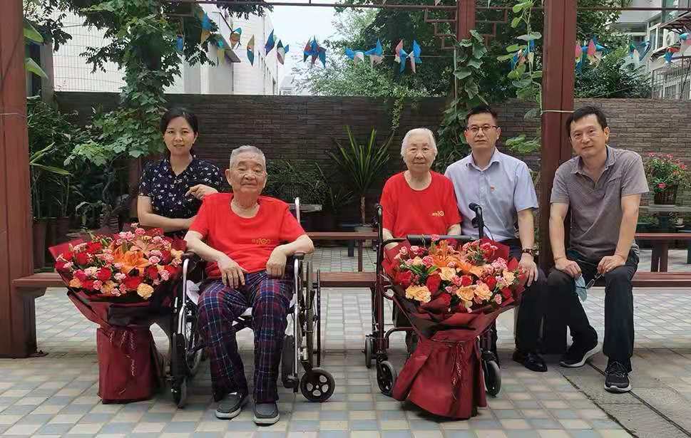 王光辉为“光荣在党68年”和“光荣在党66年”的陈祖浩老师和鲁月娥老师献花并佩戴纪念章。走访中他详细了解了老同志的生活起居和身体状况,仔细询问老同志生活中遇到的困难和问题,对老同志长期以来关心支持学院发展表示感谢,并祝愿老师们健康长寿,阖家幸福。