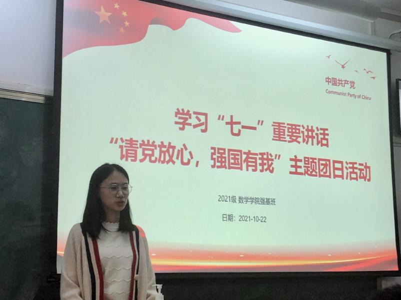 10月下旬,beat365中文官方网站2021级新生以班级为单位开展学习习近平总书记“七一”重要讲话、党史的团日活动。一班、二班、华罗庚班和强基班分别开展“请党放心,强国有我”主题团日活动,深入学习了习近平总书记“七一”重要讲话精神及在“七一勋章”颁授仪式上的重要讲话精神,深刻理解了中国共产党及共产党人在国家复兴道路上的奋斗与牺牲。同时,每个班级也在主题团日活动中,设计开展了富有特色的学习活动。