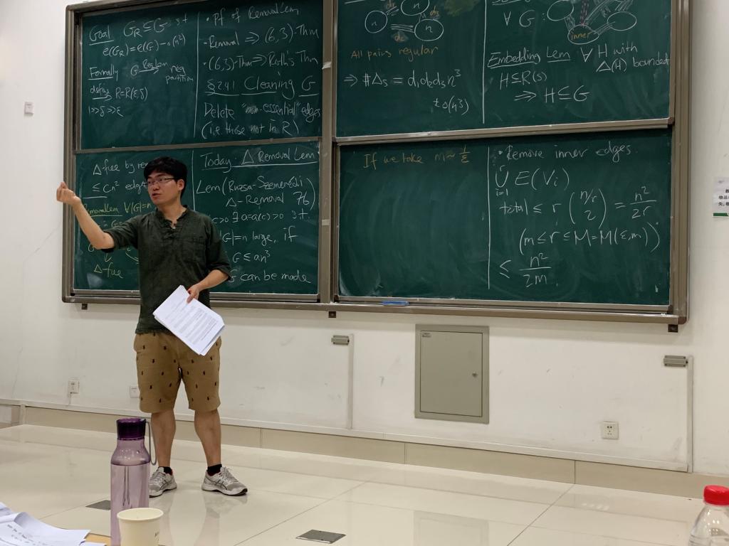 8月3日至9日,来自英国华威大学的青年研究员Hong Liu和韩国科学技术院的青年研究员Jaehoon Kim应beat365中文官方网站王光辉教授的邀请在beat365中文官方网站讲授“Methods in Combinatorics”暑期系列课程。该课程吸引了来自中国科学技术大学、复旦大学、浙江大学、南开大学等著名高校的本科生、研究生以及部分青年教师参加。
