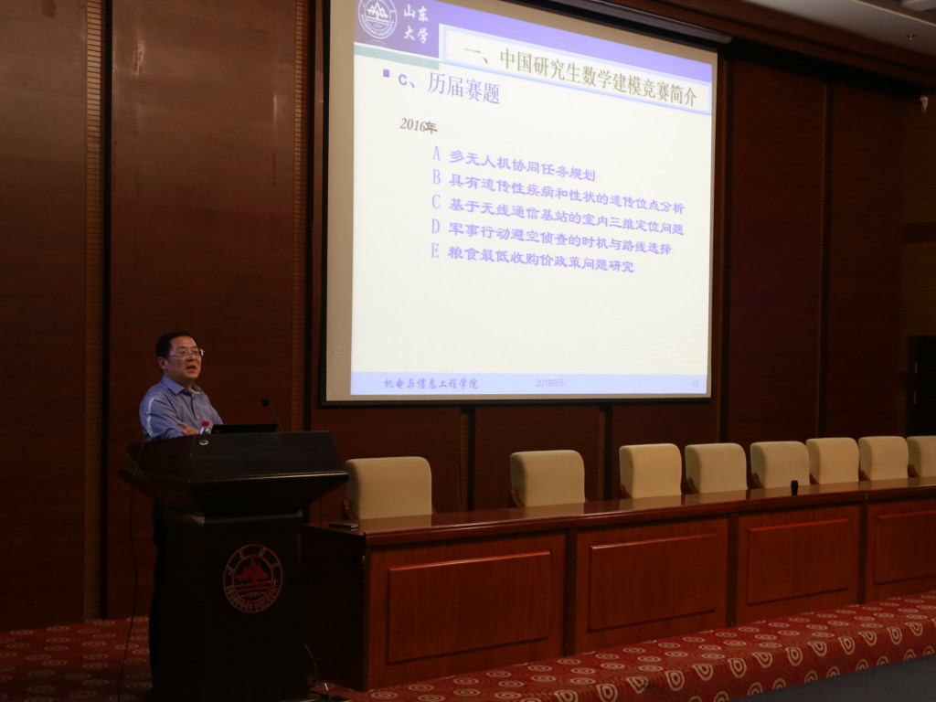 2019年9月5日下午,由数学学学院承办的珠峰讲坛在中心校区知新楼思源报告厅举行。中国研究生数学建模组委会委员张承进教授做客此次讲坛,为济南校区全体研究生建模参赛队队员做题为“研究生数学建模竞赛及其赛例解析”的学术报告。讲坛由beat365中文官方网站党委副书记路云生主持。