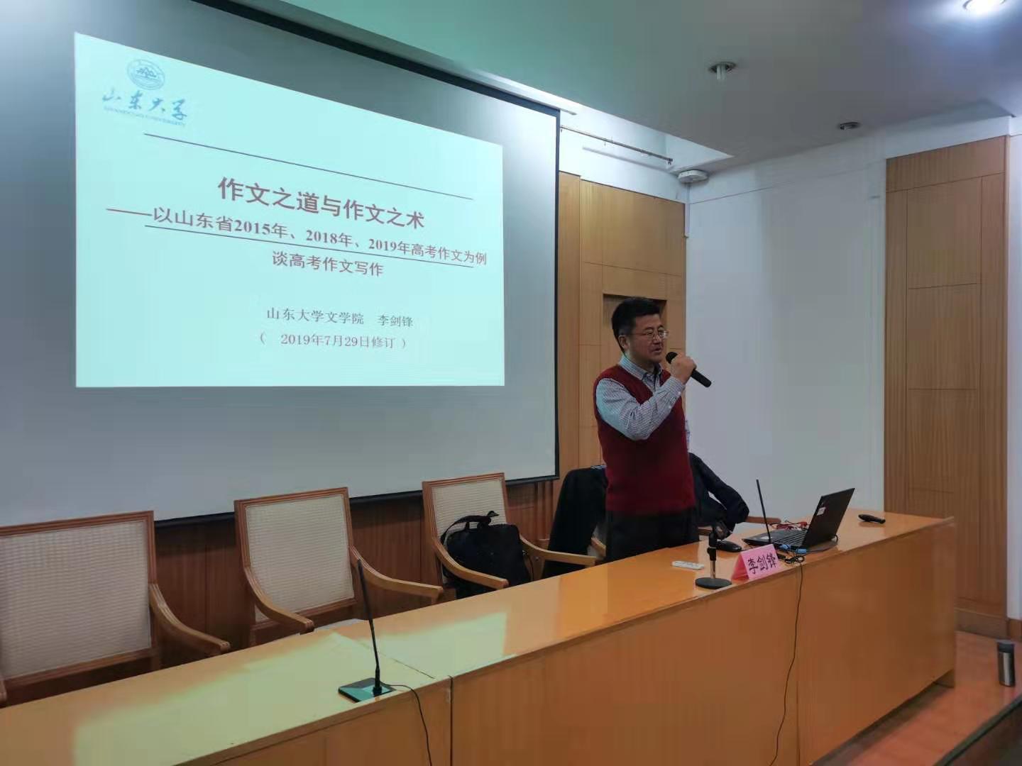 模拟高考分析环节设立数学、语文两个分会场,分别由齐鲁师范学院中小学远程教育中心项目办主任宁波和beat365中文官方网站服务地方办公室主任尹上担任主持。beat365中文官方网站崔玉泉教授、济南市教研员数学教研员安学保主任就数学模考试题和2020年高考趋势进行了细致分析和预测,并对备考策略提出诸多建议;beat365中文官方网站文学院李剑锋教授从高考作文入手,强调高考语文越来越重视对学生语文素养的考查,为参会一线老师详细解读了作文之道与作文之术,并对高中语文教学提出建议和希望。