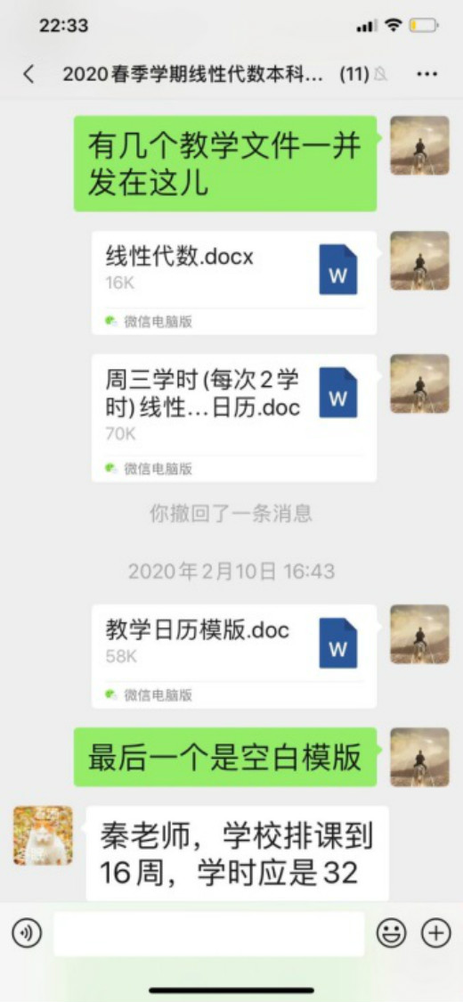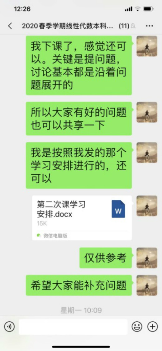 2月17日开学第一天,我的课是第1-2节,实话说心情有点复杂,有期盼也有点担心,一大早起来坐在电脑前,做好了一切准备,包括预案的第二套方案。7:50开始在微信学生群里发签到表格,感觉瞬间就签到完毕,看来师生都很期待。8:00按时上课,我首先语音介绍本次课的安排、主要学习内容等,约好讨论交流的时间,然后和学生一起观看教学视频。网络的卡顿成了主要问题,好在有第二预案,立即把学习强国上的课程链接发在学生群里,视频可以顺利看了。实际上,平台也很快解决了视频播放的卡顿问题。接下来的在线讨论交流,因为有预设的问题,开始讨论时,学生会首先回答这些问题,再进一步引出学生自己的问题,正因为这些预设的问题,又因为更多的是打字发表意见,课堂交流讨论比预期的要好很多,还可以使用@功能指定学生回答问题。课程结束后作了一个统计,全体同学都参与了交流,回答问题或提问题,最多的发言16次!