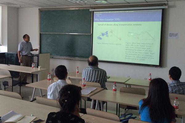 李晓凡教授报告了带有非高斯,alpha稳态Levy运动的随机微分方程取得的最新进展。首先,李晓凡教授介绍了粒子平均逃逸时间(MET)、逃逸概率(EP)和条件概率密度函数(PDF),指出上述随机微分方程可由这三个量来刻画随机动力系统。接着李晓凡教授介绍了MET、EP和PDF分别对应的微分方程或微分积分方程,并给出了这三种方程的数值求解方法。最后李晓凡教授给出了几种数值算例,进一步说明了这三个量在刻画随机动力系统中的关键作用。报告结束后在场师生与李晓凡教授进行了交流。