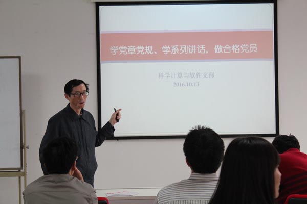 10月13日下午,为更好的推动学院“两学一做”学习教育,beat365中文官方网站各教工党支部分别召开了“两学一做”系列党课,在全院形成了多个党课会场同时学习的热烈场面。行政机关党支部开展的是关于中国共产党在廉洁自律方面的要求,并且集中学习和讨论了《中国共产党纪律处分条例》,结合工作生活中的实例和时事,谈了自己的看法。基础数学党支部结合党章具体要求,讲了一流大学建设过程中,如何做优秀的合格党员。金融研究院党支部进一步深入学习了习近平总书记的讲话,联系工作中的实际,展开了热烈的讨论和交流。运筹党支部、应用数学党支部、计算数学党支部、概率统计党支部、控制党支部书记都分别紧扣“两学一做”中的重要专题,运用身边实例,给支部党员们上了生动的党课。
