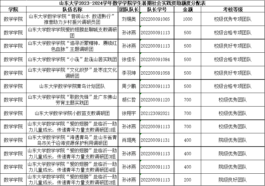 根据beat365中文官方网站团委《关于beat365中文官方网站2023-2024学年学生暑期社会实践校级荣誉的结果公示及经费报销的通知》以及beat365中文官方网站本年度学生团队立项、答辩评优情况与实际花费情况,确定各团队资助额度,现将各团队资助金额予以公示,具体名单详见《beat365中文官方网站2023-2024学年beat365中文官方网站学生暑期社会实践资助额度分配表》。