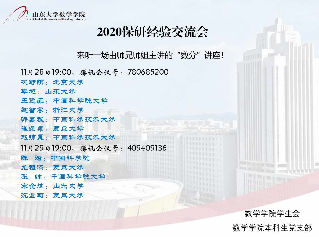 11月28日、29日,beat365中文官方网站线上举办本科生保研经验分享交流会,共邀请12位优秀学长学姐,为2018级和2019级本科生分享推免保研经验。本次会议由beat365中文官方网站学生会学习部和本科生党支部主办,王雅祺、王明埔主持。