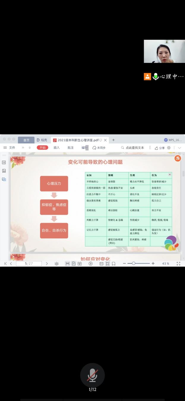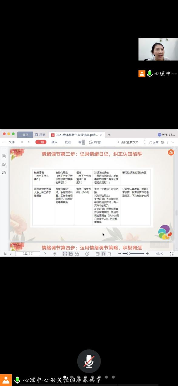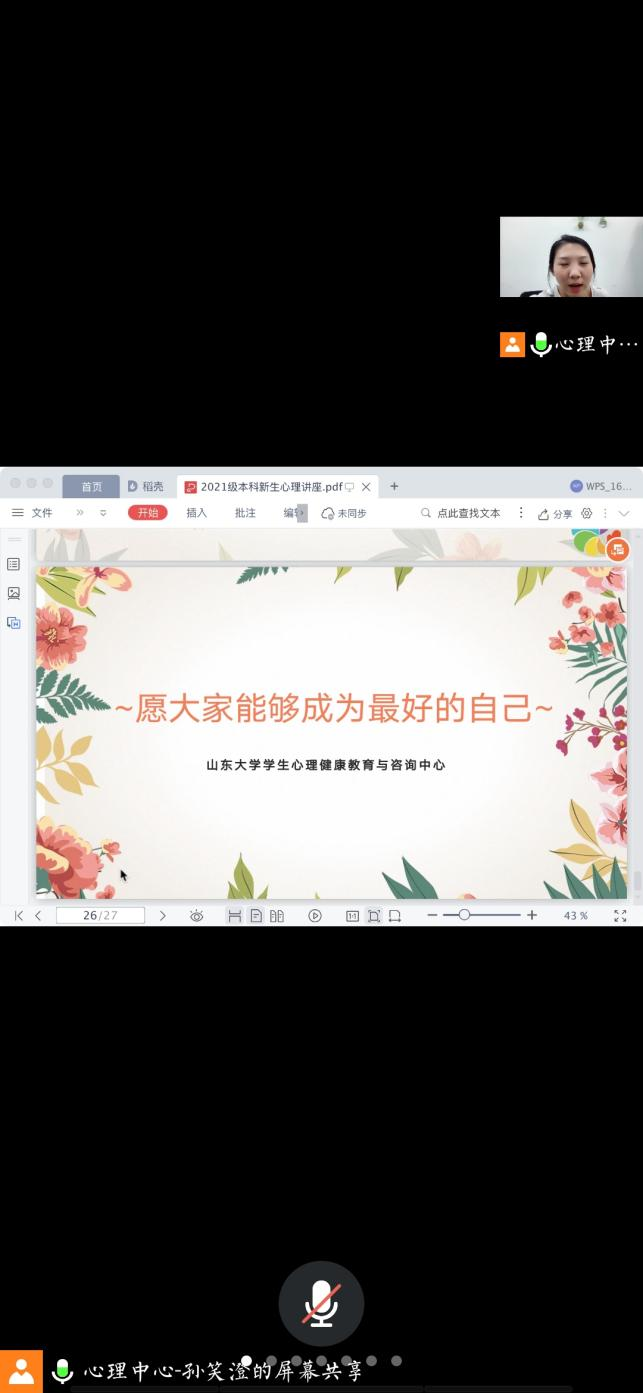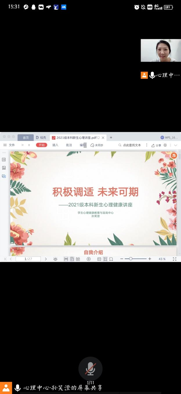 2021年9月26日下午3时,beat365中文官方网站在线上召开了2021级本科新生心理健康讲座,辅导员宋金灿老师与2021级beat365中文官方网站全体同学参会。学生心理健康教育与咨询中心的孙笑澄老师以“积极调试,未来可期”为主题,向同学们介绍了初入大学可能会出现的心理问题,并讲述了相关解决问题的方法。