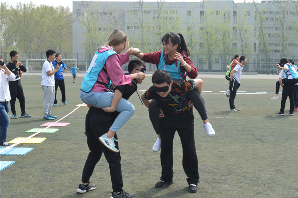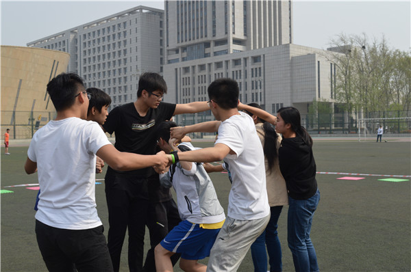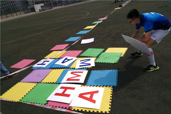 本次运动会共设有男背女撕名牌、四子棋接力赛、蒙眼取物、旋转成圆和血腥撕名牌五个项目。首先进行的是男背女撕名牌项目,比赛刚刚开始,17级1、2两班代表队便联手淘汰了一组选手,推动比赛走向白热化,经过一番激烈的角逐,最终17级基地班获得了该项目的胜利。随后进行的四子棋接力赛中,对阵双方你来我往,在放置己方棋子的同时也不忘消除对方的棋子。为了将“MATH”四个字母拼成一条直线,各个班级在本环节斗智斗勇,精彩异常。蒙眼取物项目中,参赛选手虽然被蒙住了眼睛,但在另一位同学的指引下,比赛开始不到两分钟,便通过默契的配合取下了横杆上的卡片,顺利完成了比赛。旋转成圆计时赛要求在队员互相握着手的前提下迅速转为一个圆,充分考验了参赛选手之间的默契。同学们从最初的纠缠在一起,通过各种办法,解开彼此之间的结,还原成一个圈,最终17级1班以领先第二名一秒的微弱优势夺得该项目的冠军。