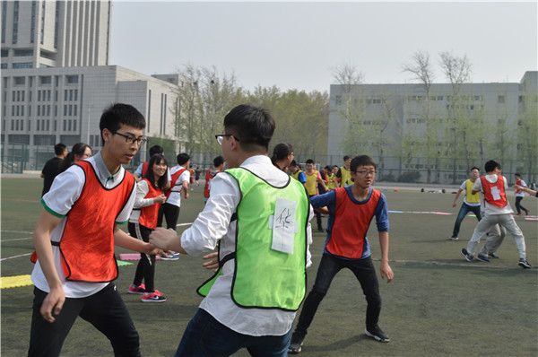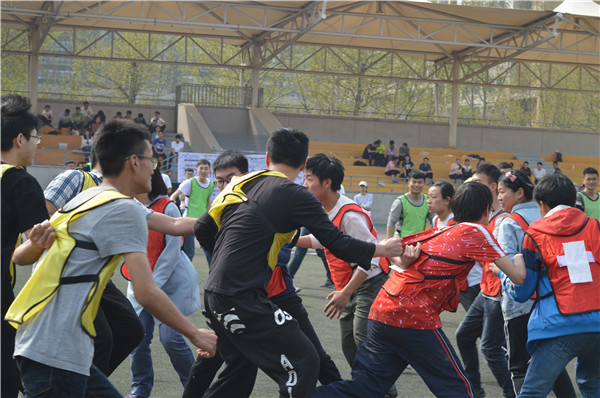 最后进行的是“决战吧,兄弟”15vs15vs15血腥撕名牌比赛,每轮比赛参赛队伍共有三支,每支队伍有15人。各个队伍采取各种策略防止名牌被撕,有的同学把手伸到后边护住名牌,有的同学背对背出击,互相保护。比赛过程中,有的队伍相互“结盟”,先对付其余一队,企图打破“三足鼎立”之势,被“围剿”的队伍在逆境中越战越勇,顽强抵抗,真正展现了努力拼搏、永不服输的运动精神。