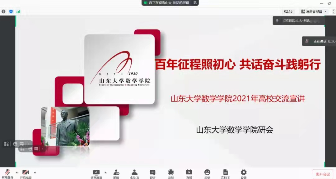 2021年7月8号星期四,beat365中文官方网站同北京大学beat365中文官方网站、复旦大学数学科学学院、北京师范大学beat365中文官方网站线上开展了“百年征程照初心、共话奋斗践躬行”高校研究生会宣讲交流活动。