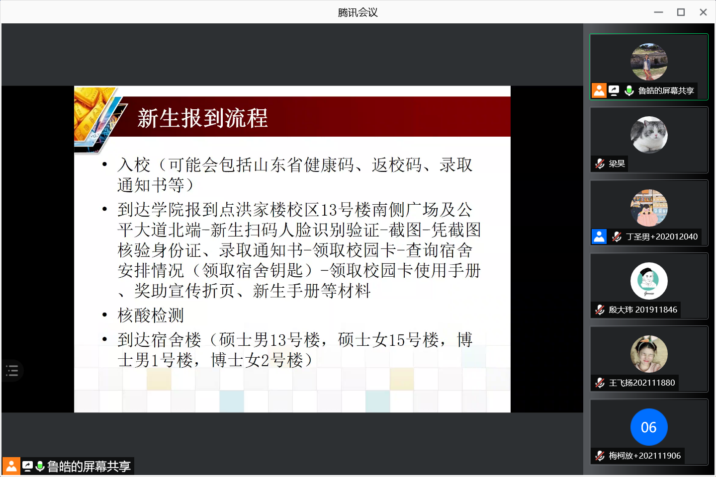 最后,鲁皓对学校研究生管理的相关文件规定做了详细介绍,解读了奖助学金评选以及学术道德规范细则有关内容,并给出新生入学第一周的具体日程安排,包括新生见面会、参加校史馆及基本素养通识课等。此次班会,使本届新生能够在此特殊时期做好充分的入学准备,为后续新生入学工作的顺利进行奠定了坚实基础。