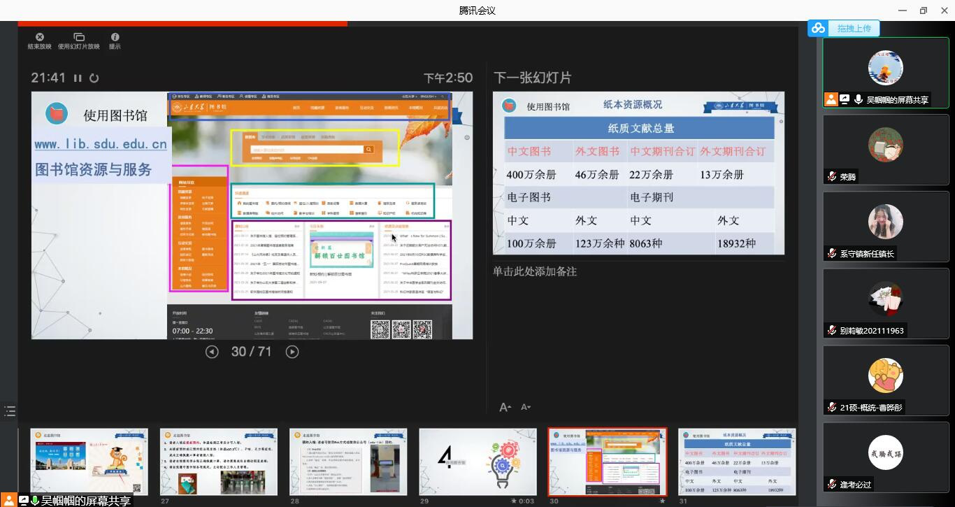 9月10日下午,beat365中文官方网站图书馆的吴帼帼老师为beat365中文官方网站2021级研究生新生做了“图书馆资源与服务”的线上讲座,讲座主要围绕图书馆历史和资源服务展开。