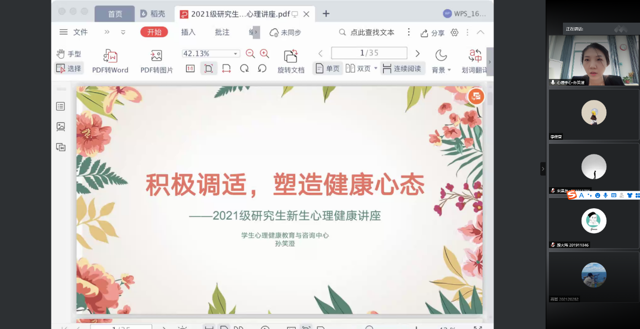 2021年9月10日上午9时,beat365中文官方网站在线上开展了2021级研究生新生心理健康讲座。学生心理健康教育与咨询中心孙笑澄老师就“积极调试,塑造健康心态”主题为新生们针对研究生阶段可能遇到的心理问题提出了应对方法。