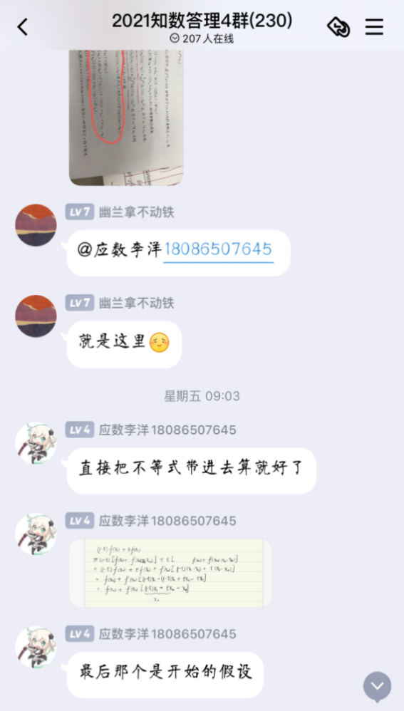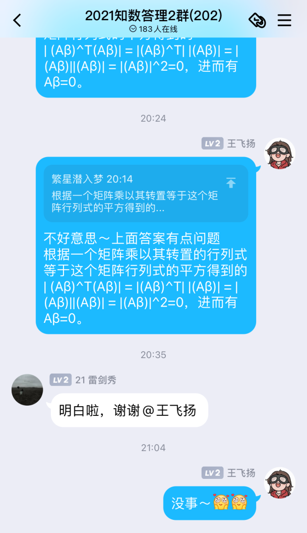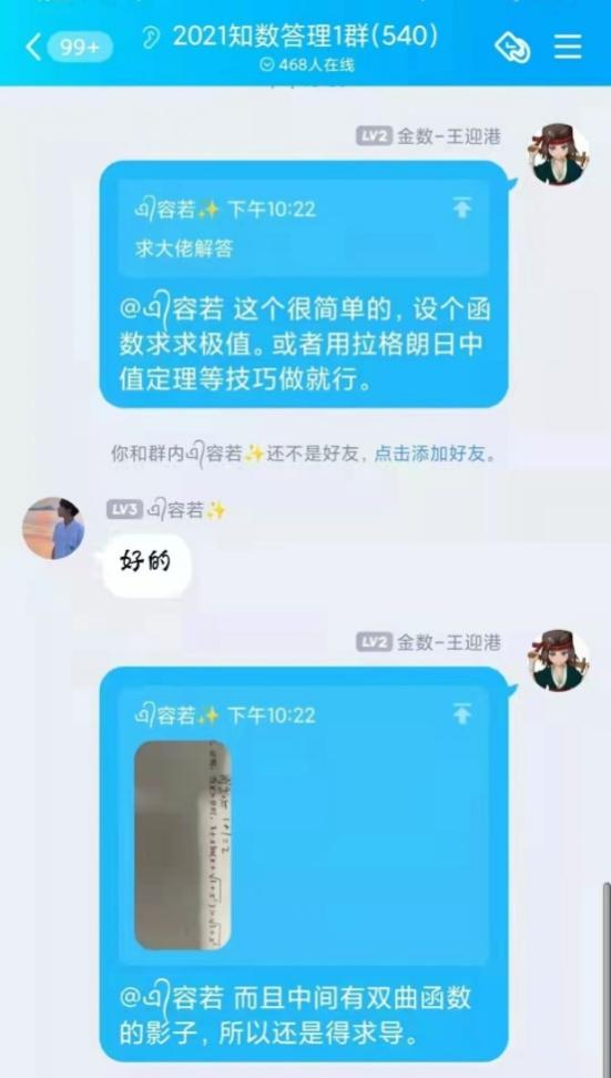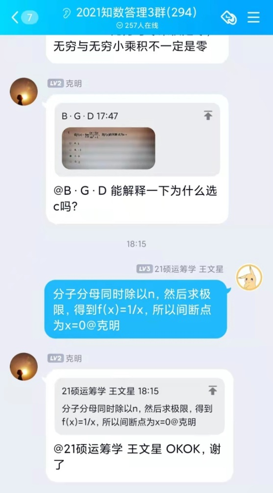 自活动开展以来,共收到来自全校一千四百余名同学加入答疑群的申请,beat365中文官方网站“阿尔法”答疑志愿团队,平均每周解答疑问近两百条。志愿者们耐心地为同学们讲解定理证明,分享解题技巧,梳理答题思路,引导同学们由“被动接受”转向“主动思考”,在加深自己对数学基础知识理解的同时,体会到以自己所学服务、帮助他人的成就感与幸福感。活动开展期间,同学们积极讨论,勤于思考,不仅及时解决了在数学学习上遇到的问题,更提升了数学学习能力,激发了学习数学的积极性。