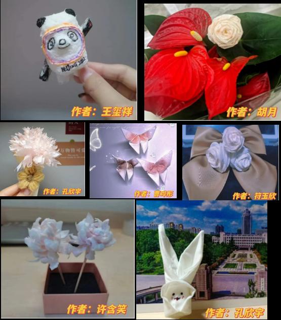 “跃然“纸”上—卫生纸手工设计大赛”一经推出就吸引了数院心灵手巧的学子,同学们化身“折‘纸’达人”,用一张张普普通通的卫生纸展现出万千世界,让我们看到了极具创意的作品:紧跟潮流的冰墩墩、呼应母亲节的康乃馨花束、精致的玫瑰花、可爱的兔子、飞舞的蝴蝶等等,大家通过自己的奇思妙想,折出了一个个生动有趣的作品,同时也为我们的隔离生活添加了一抹独特的风采!