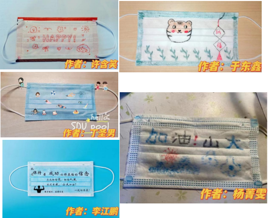 口罩可以遮住口鼻但遮不住我们的多样个性,更遮不住我们想要传达的情感。在本次活动中,数院学子充分发挥自己的个性与才能,但不谋而合,大家都用口罩传递出了自己对当下的美好祝愿:口罩上的小老虎寓意虎年大吉、虎虎生威;口罩上的“山大加油”字样,为隔离的师生送去了力量,展现出了山大人的同力协契......同学们还将自己制作的口罩送给了老师、测核酸的“大白”、志愿者、以及隔离结束后的自己,表达出的是满满的感恩之心和对未来的美好期盼。原本单调的口罩在同学们的精心绘制下变得生动活泼,仿佛有了生命,一只只精美的口罩体现出数院学子阳光健康、积极向上的的风采!