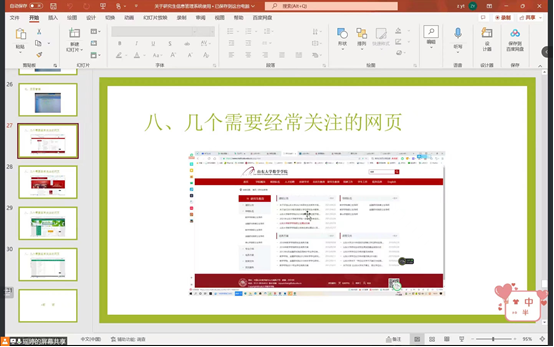 会议第二部分,张瑶婷老师首先简要地向大家说明了目前双选会以及线上教学准备进度,表示老师们正在紧锣密鼓地准备线上教学,同时期待与诸位新同学的见面。而后,张老师从课程和学分、培养环节以及重要的时间节点等方面详细地介绍了培养方案的内容以及熟知培养方案的重要性。最后,张老师为大家详细地介绍了研究生信息管理系统的使用方法和选课注意事项。