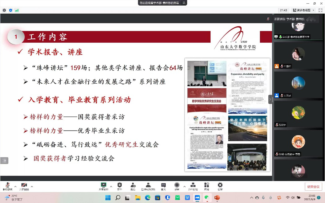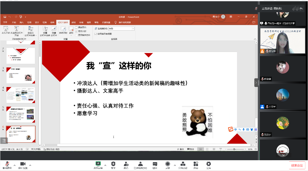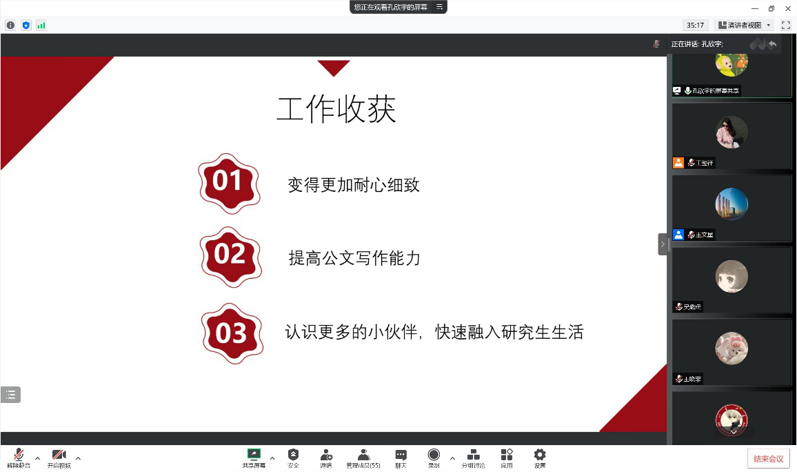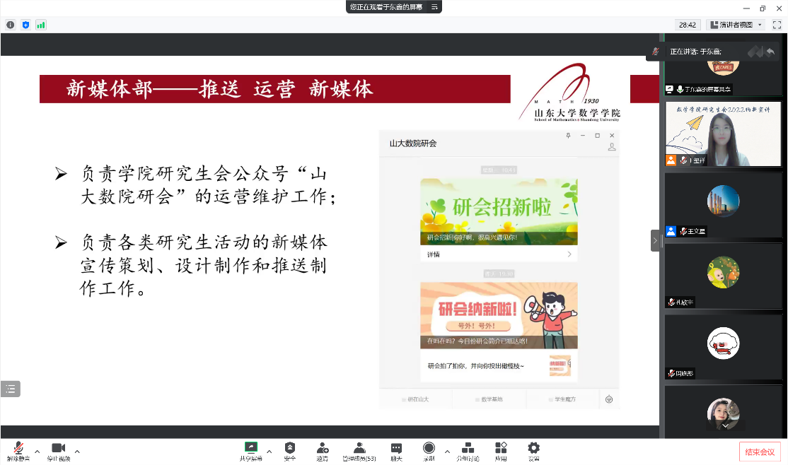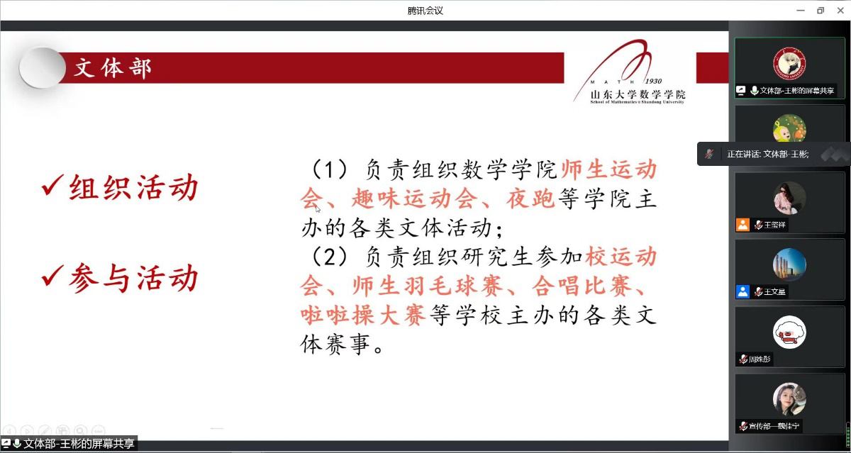 为更好地宣传beat365官网研究生会,同时为研究生会注入新鲜活力,更好地发挥研究生会服务全院师生的工作职能,2022年9月9日晚,学院研究生会主席团及各部门部长通过线上会议进行了研究生会纳新宣讲。纳新对象为2022级beat365中文官方网站全体研究生,宣讲会议由研究生会副主席王文星主持。