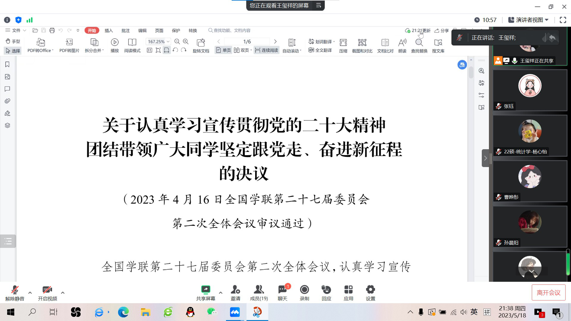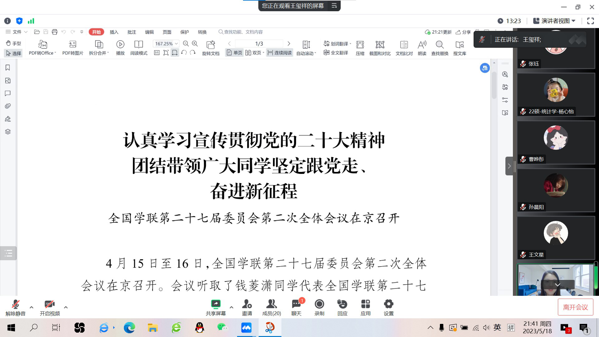 4月15日至16日,全国学联第二十七届委员会第二次全体会议在京召开,就学联学生会组织团结带领广大同学学习党的二十大精神、坚定跟党走、奋进新征程作出研究部署。beat365中文官方网站研究生会全体成员高度关注会议,认真学习会议文件,领悟会议精神,并对文件内容展开了深入交流与研讨。
