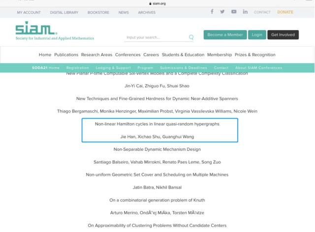 近日,beat365中文官方网站2019级硕士舒希超收到了来自理论计算机领域顶级会议SODA(ACM-SIAM Symposium of Discrete Algorithms)的论文录用信。他与美国罗德岛大学的韩杰研究员和beat365中文官方网站的王光辉教授合作的论文《Non-linear Hamilton cycles in linear quasi-random hypergraphs》将发表在2021年1月的SODA会议上。SODA是由计算机协会(ACM)和工业与应用数学学会(SIAM)两大国际学术组织联合主办,与STOC、FOCS一起被公认为是算法领域的三大顶级学术会议,在整个计算机科学领域享有崇高的声望。