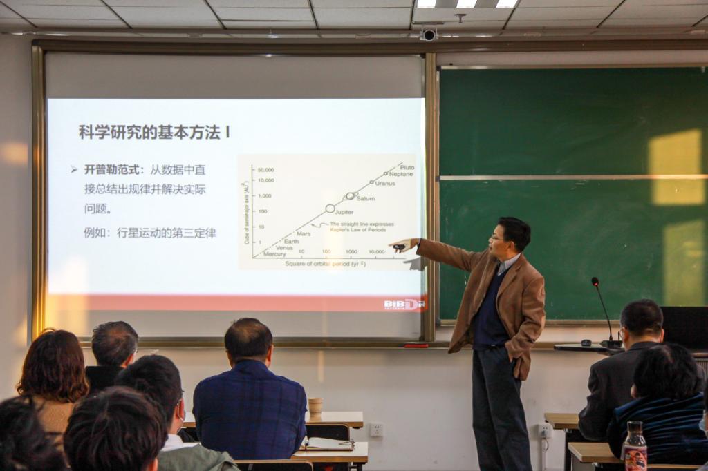 鄂维南首先指出,机器学习取得的突破不仅给人工智能带来了新的生机,也给科学研究带来了前所未有的机会。传统的科学方法和机器学习方法的有机结合,为科学研究提供了一个崭新的、更为有效的研究方式,同时也将大大缩短科研场景与实际场景之间的距离,使科学研究和技术创新得到更深层次的融合。随后,鄂维南又介绍了在机器学习和人工智能实践中取得成功的情况下,数学学科所面临的机会和挑战,引发了在座教授和同学们的思考,同时也让大家了解到数学应用的前景。