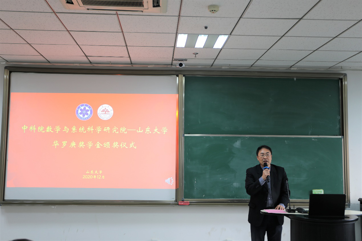 曲明军宣读了《关于表彰2020年度华罗庚奖学金获得者的决定》。获奖代表2019级学生徐丰在发言中介绍了自己在华罗庚班的学习情况,他由自身经历谈起,表达了对班级的感激之情,并表示自己将不辜负老师们的殷切期望,努力学习为数学学科的发展贡献自己的力量。