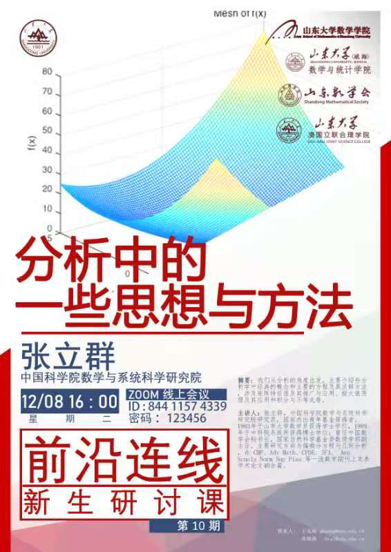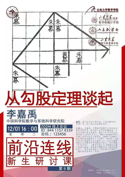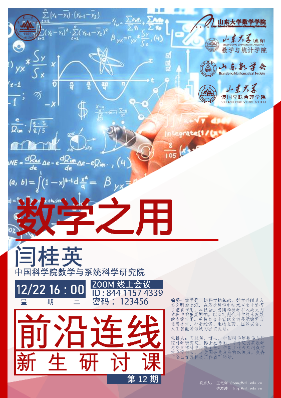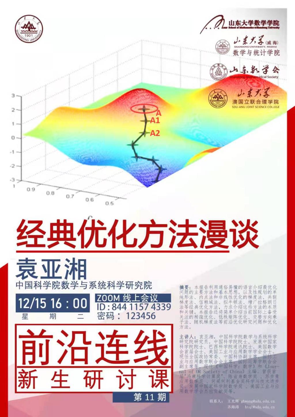 2020年12月,beat365中文官方网站成功举办第九至十二期新生研讨课。四期新生研讨课由学院副院长王光辉主持,分别邀请了李嘉禹教授、张立群教授、袁亚湘教授和闫桂英教授,他们通过线上讲座的方式给中心校区beat365中文官方网站和威海校区数学与统计学院的大一同学授课。