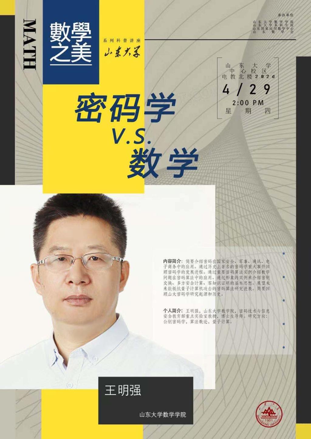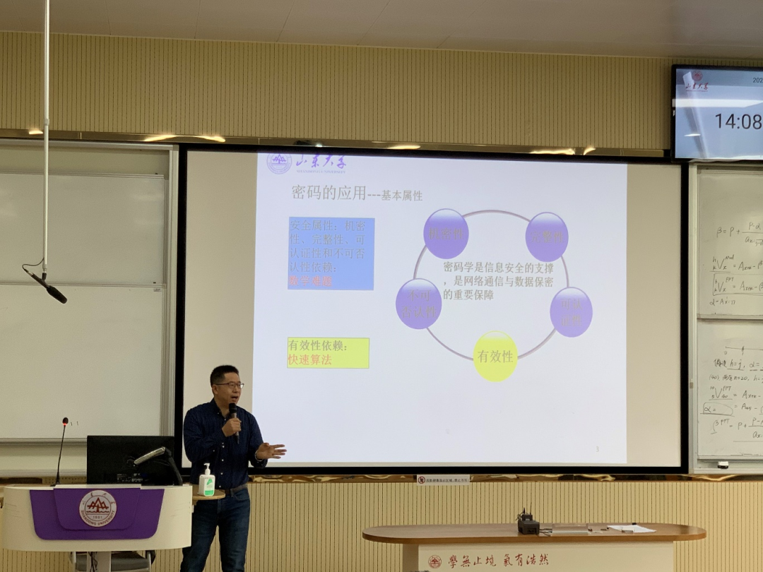 4月29日下午,数学之美首场讲座在电教北楼202d举行,密码技术与信息安全教育部重点实验室教授、博士生导师王明强作“密码学V.S.数学”主题讲座,2020级全体同学参加。本次讲座由辅导员桑军帅主持。
