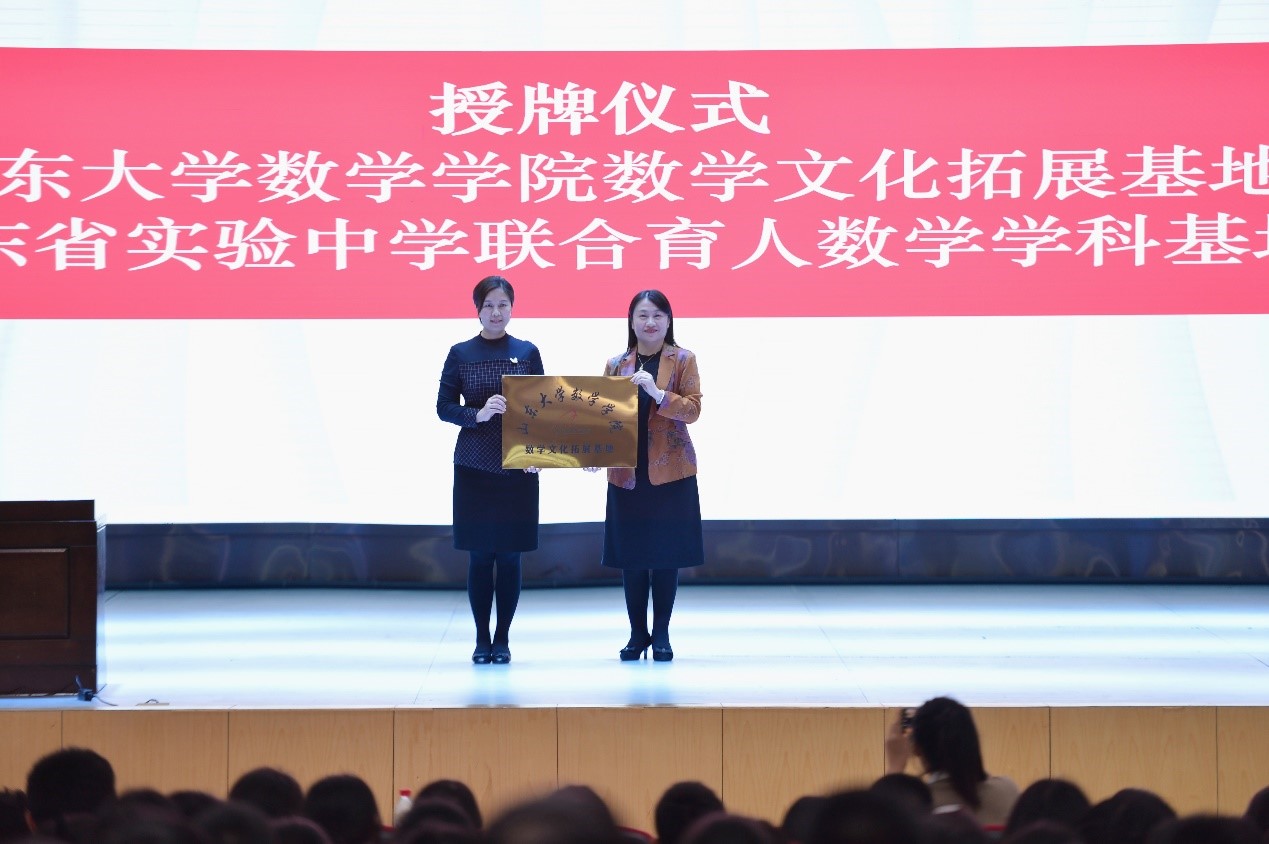 协同育人,完善长效机制。为进一步完善基础学科教育人才培养的长效机制,beat365中文官方网站借助“数学文化节”,与山东省实验中学合作建设数学文化拓展基地,开启双高协同育人新篇章。3月10日,beat365中文官方网站党委副书记王苗雨和省实验中学副校长范海沛代表双方学校相互授予匾牌。学院冯俊娥教授为学生们作《黄金分割》主题讲座,赢得阵阵热烈掌声。冯教授不时与现场同学互动,并赠送科学书籍作为奖励。现场师生700余人聆听了报告。