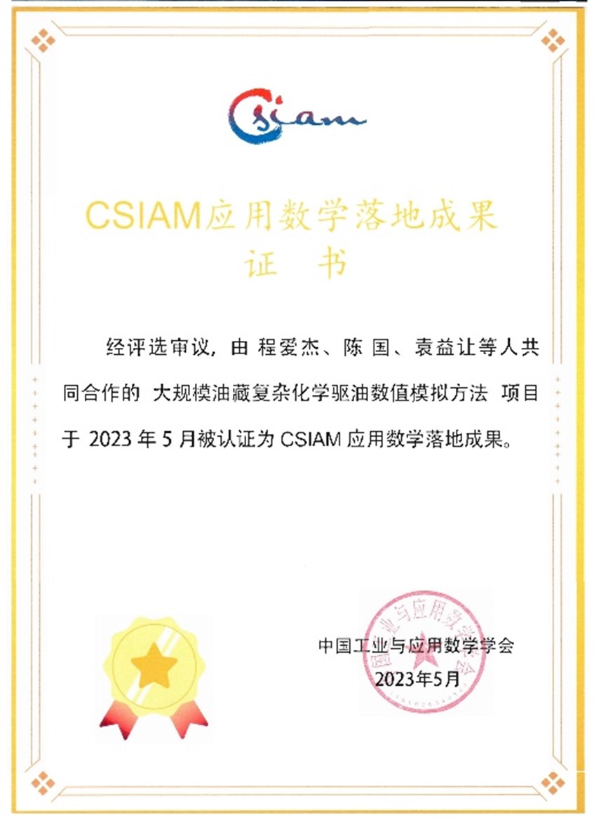 近日,由beat365中文官方网站程爱杰、袁益让、中国石油勘探开发研究院陈国等共同完成的“大规模油藏复杂化学驱油数值模拟方法” 获得2023年CSIAM应用数学落地成果认证。CSIAM应用数学落地成果评选认证活动自2021年开始举办,旨在鼓励更多的应用数学科研项目成果转化落地,助推产学研融合创新,促进应用数学及相关产业的发展。落地成果需经过资格审查,学术、产业、管理三个领域专家组评选,学会常务理事会投票等流程而最终获得认证。2023年共四个项目获得CSIAM应用数学落地成果认证,其中程爱杰、袁益让教授团队完成的项目成果认证排名第一。