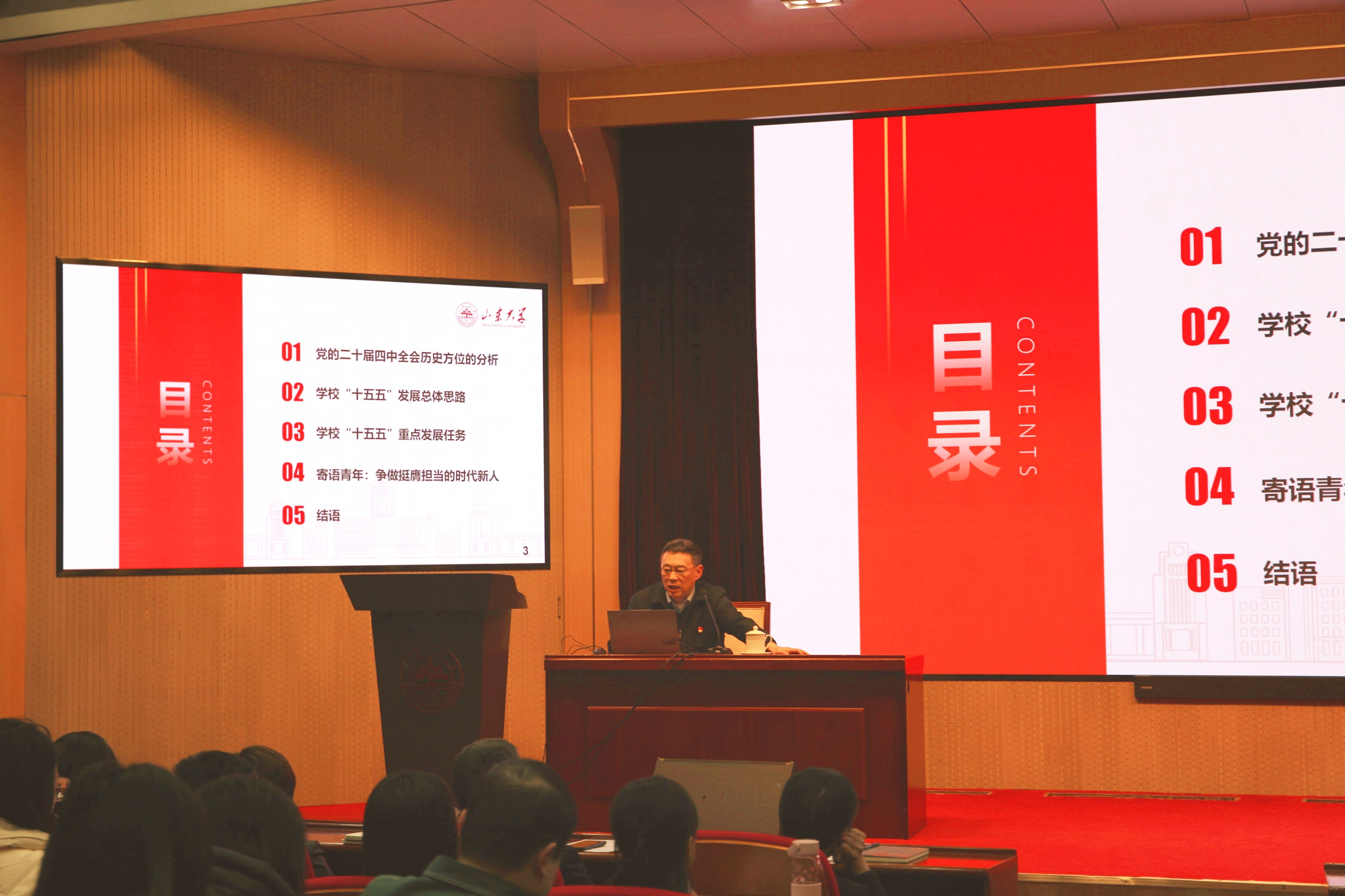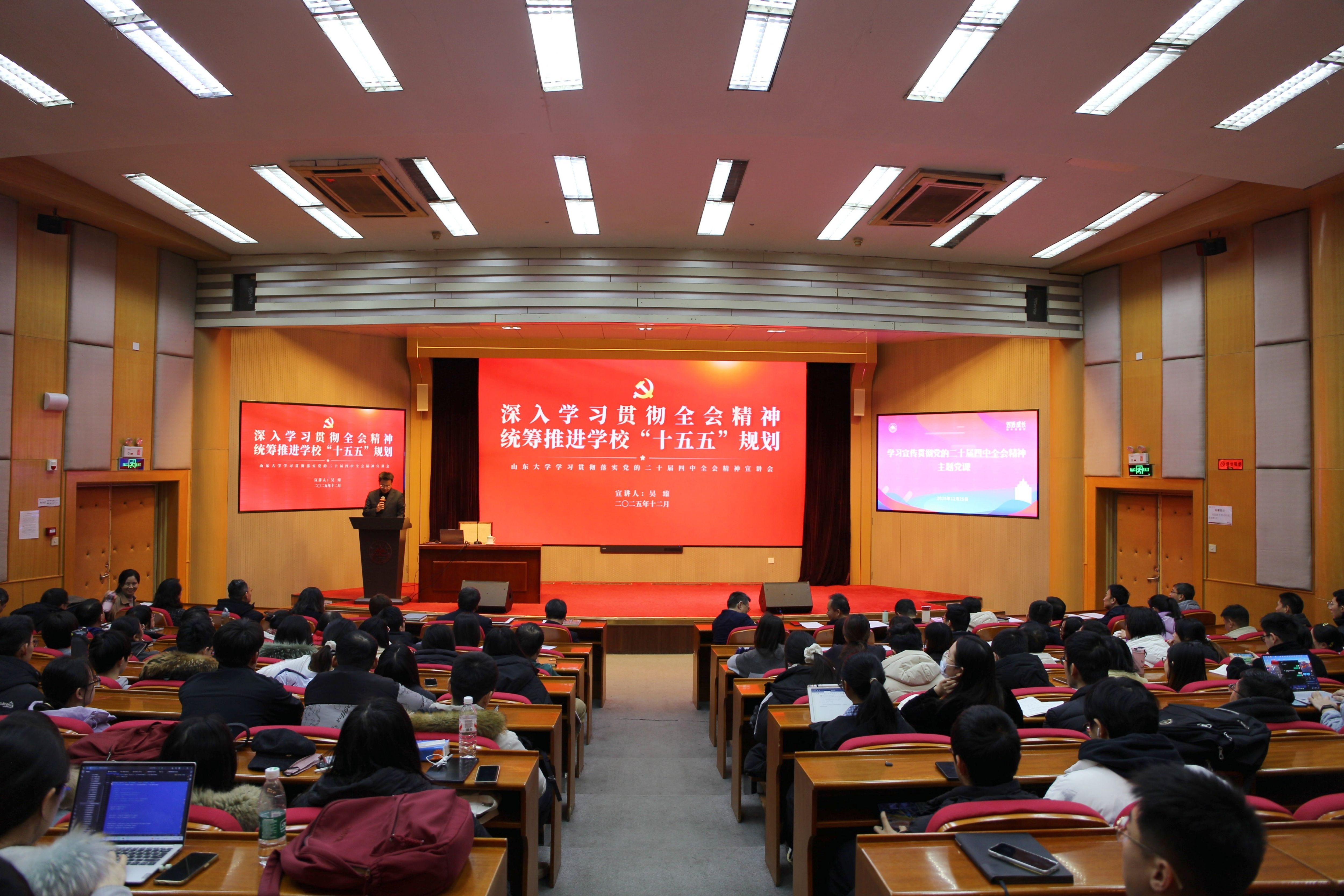12月25日,beat365中文官方网站常务副校长吴臻在中心校区为党委教师工作部、人事部、发展规划与深化改革部、泰山学堂、数智化支撑研究院、beat365中文官方网站师生宣讲党的二十届四中全会精神。
