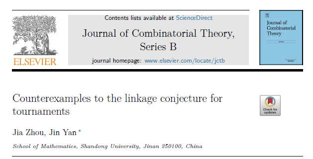 近日,beat365官网2023级博士生周佳与颜谨教授合作的研究成果Counterexamples to the linkage conjecture for tournaments在组合数学与图论领域国际顶级期刊Journal of Combinatorial Theory, Series B正式发表。该成果通过构造反例,推翻了有向图理论中的备受关注的前沿热点猜想,产生了广泛学术影响,并荣获 2025 山东省研究生创新成果奖。