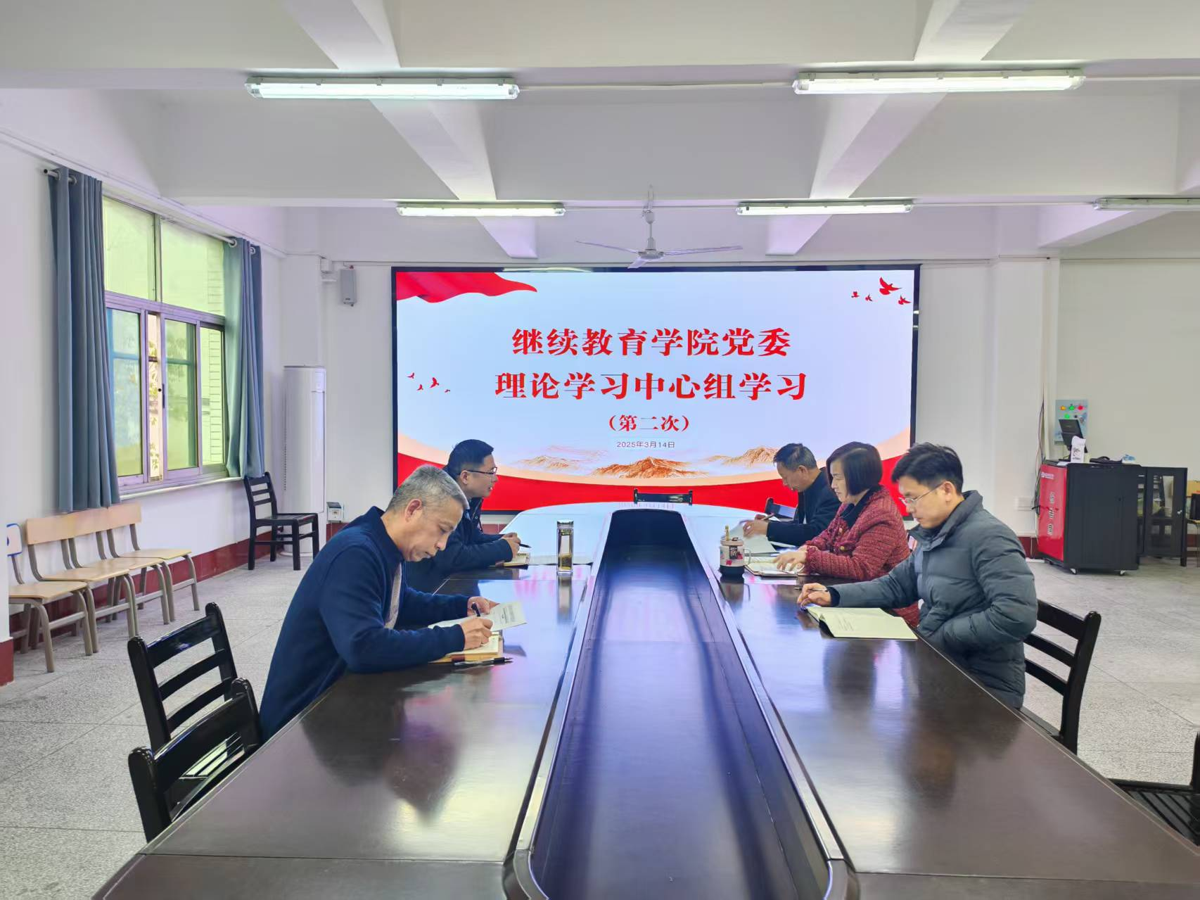 下午 3:00 - 17:30,集体学习研讨在三楼会议室举行。党委书记金延安主持会议,党委理论学习中心组成员全员参与。学习围绕全国 “两会” 精神展开,深入学习习近平总书记在全国两会期间系列重要讲话精神和全国两会精神,同时结合全省加快建成中部地区崛起重要战略支点推进大会精神、2025 年 2 月 28 日省委理论学习中心组集体(扩大)学习会议精神进行研讨。此外,还学习了中共中央办公厅关于印发《党委(党组)落实统战工作责任制规定》、中共中央和国务院发布的《教育强国建设规划纲要 (2024—2035 年)》、湖北省委和省政府出台的《教育强省建设行动纲要 (2024—2035 年)》、第 28 次全国和全省高校党的建设工作会议精神,以及全市加快打造武汉都市圈绿色发展重要增长极和自然生态公园城市大会精神与咸宁市战略规划等内容。