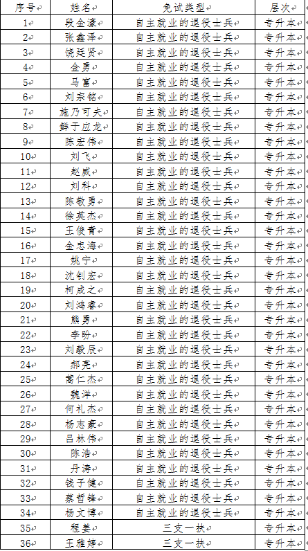 根据教育部和湖北省关于高校成人教育招生考试免试条件的有关文件规定和要求,退役军人免试条件是专科毕业且自主就业或者自主择业的考生,“三支一扶”条件是普通专科毕业且有“三支一扶”证明的考生。今年报考必赢官网的免试生有两种类型:退役军人和三支一扶考生。经必赢官网对考生材料初步审核,36名考生符合免试条件。现公示如下: